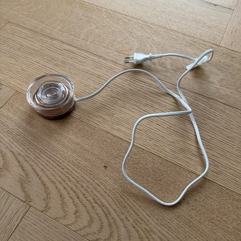 Philips laddningsstation med vit sladd. Har liten tapp upptill för att ställa apparaten på och gummifötter undertill som gör att den står stadigt.