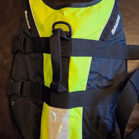 Ny flytväst 5-15kg, begagnat flexikoppel med halsband men fullt fungerande. Div hundskålar,vattenflaska med skål, ett vanligt koppel med halsband