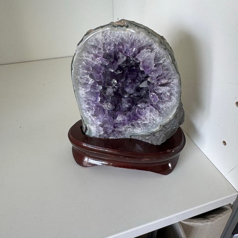 Fin geodsten med kristaller och en liten gruvarbetarfigur inuti. Står stadigt på ena sidan och har en blank metallfärgad detalj i mitten.