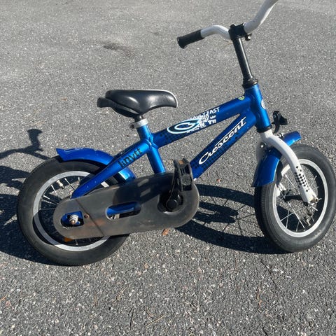 Blå Trek barncykel med 12" hjul, röd detaljfärg på handtag och pedaler. Utrustad med styrstång bak och fotbroms samt reflex fram och bak.
