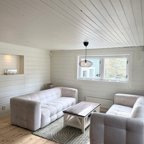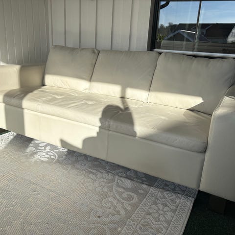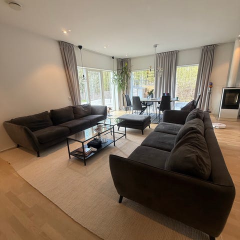 Moderna och tidlösa möbler som är i bra skick, sköna att sitta i och lätta att möblera modernt med. Sofforna och fotpallarna är i äkta skinn som blivit finare med åren.