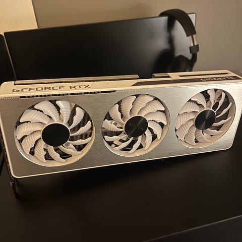 Gigabyte GeForce RTX grafikkort i vit design med trippelfläkt. Har 8‑pins strömkontakter upptill och vit sidopanel med RGB‑detalj.