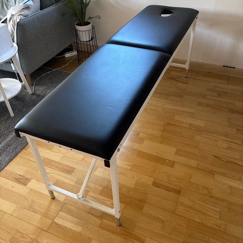 Delta Professional behandlingsbänk i grön färg med vadderad liggyta. Höj- och sänkbar modell med flera sektioner och armstöd. Elektrisk