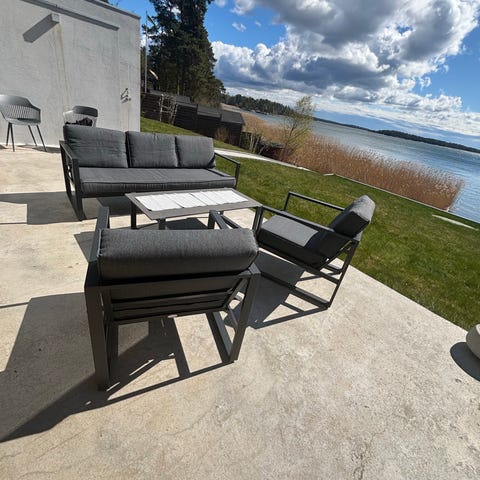 Utegrupp med svart soffa och två stolar med grå dynor. Har alltid stått på inglasad balkong fram tills för några veckor sedan.