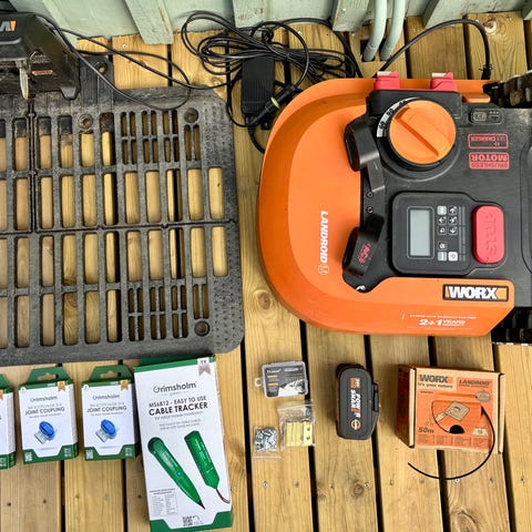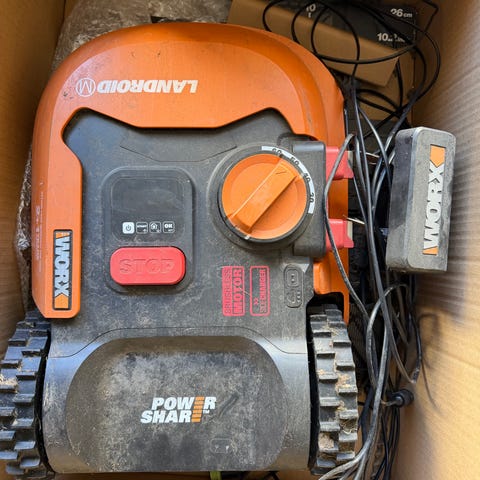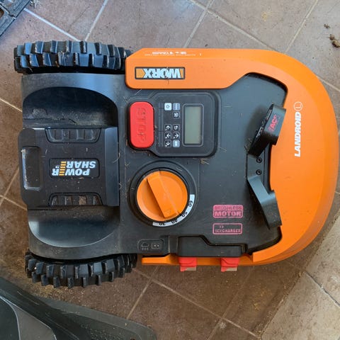 Worx Landroid M500 robotgräsklippare i orange och svart med tydliga reglage på ovansidan. Har larvband, laddstation och grön begränsningskabel som syns på bilden.