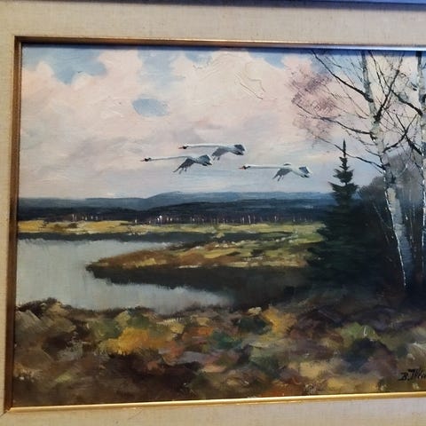 Fin tavla med lantlig väg, hus och blå himmel i träram. Passar bra om du gillar naturmotiv och klassiska landskap på väggen.