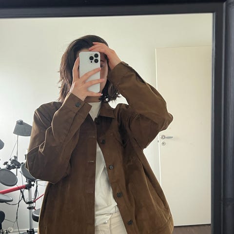 Beige mockajacka i safarimodell. Flera utanpåfickor, knäppning med dragkedja och knappar samt justerbar dragsko i midjan. Storlek M. Jag är 187 och 82 kilo.