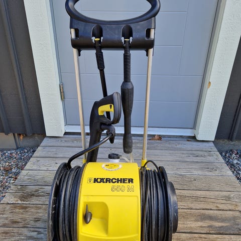 Kärcher T-Racer terrassborste till högtryckstvätt i gul/svart med runt handtag och justerbart reglage på ovansidan. Har långt skaft och plastskärm som skyddar runt borsten. Utan kartong