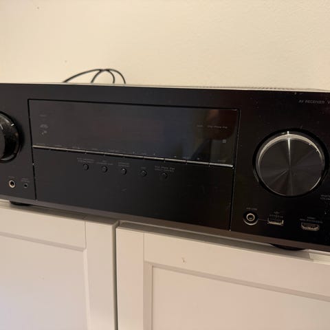 Pioneer VSX-1015 flerkanals AV-receiver i svart med stora rattar fram och tydlig display. Har flera knappar för olika ingångar på fronten och rejäl ventilering upptill.