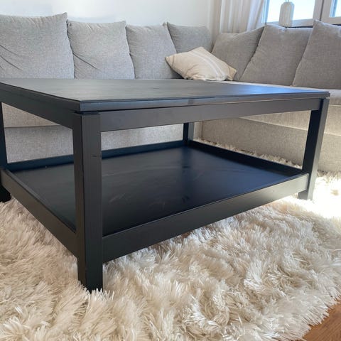 Vitt soffbord från IKEA med hylla för förvaring.