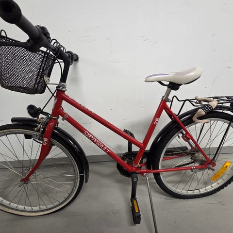 Röd Crescent damcykel med 28" hjul i stl M. Utrustad med korg fram, pakethållare bak, kedjeskydd och stöd.