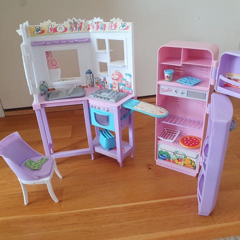Barbie köksset med pizzaugn, bakugn, två bord, och stolar. Följer med massor av små tallrikar, bestick, formar och annat kökstillbehör i olika färger.