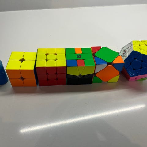 Flera olika speedcubes och pusselkuber i olika former och färger, bland annat klassisk 3x3-kub och pyramid. Säljs som ett paket med kuberna på bilderna.