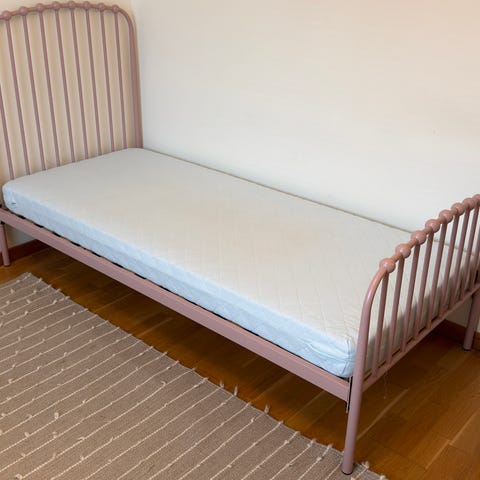 Rosa metallsäng växasäng, madrasser 3 st medföljer om man önskar. Sparsamt använda då sängen knappt anvvänds.