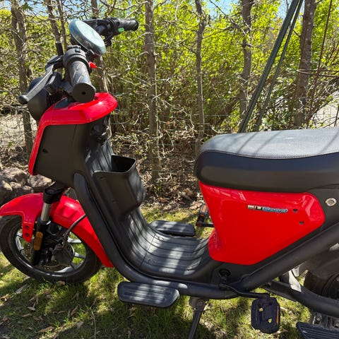 elmoped i svart med digital display och rund framlykta. Har fotplatta, dubbelsadel och fjädring bak samt skivbroms fram.