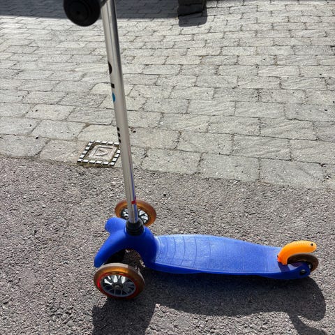 Blå Stiga sparkcykel för barn med tre hjul och låg ståplatta.