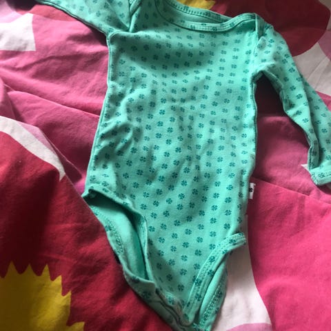 Paket med flera långärmade bodys och ett par leggings från H&M i stl 80, alla i mjuk bomull. Olika färger och mönster med tryckknappar i grenen på bodys och resår i midjan på byxorna.