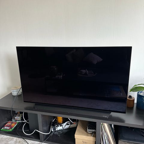 TV Sony med soundbar med matchande subwoofer i svart. Enkel att ställa framför tv-bänken och subben står på golvet bredvid.