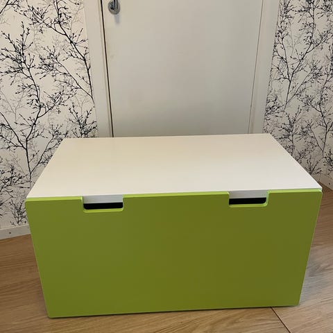IKEA barnbokhylla i vit färg med grön baksida. Hyllan har ett öppet övre fack och ett större nedre parti som kan användas för förvaring av böcker, leksaker eller spel. Sidorna är släta och hyllan är anpassad för barnrum med låg höjd på hyllplanen så att barn lätt kommer åt sina saker. Passar som sänggavel eller mot vägg i barnrum, lekrum eller vardagsrum som förvaringsmöbel för barnens saker.