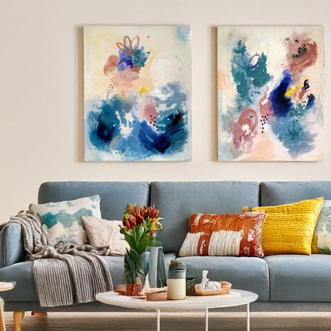 Tavla av bildkonstnär Åsa Sjö med abstrakt motiv i blå och gröna toner, signerad 2025. Målad på duk som är uppspänd på kilram, redo att hängas upp på väggen för den som vill äga ett original.