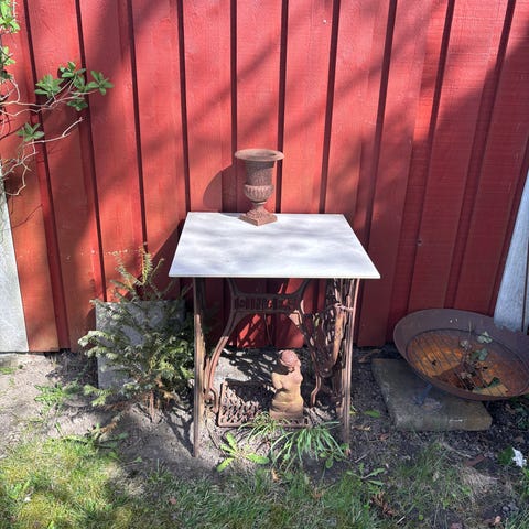 Trädgårdskamin med nät runt om och lucka framtill. Står på fyra ben och har hög skorsten upptill. Ett ben är lite löst men går att fixa. Inget som påverkar funktionen.