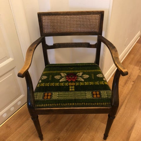 Svart, stadig taburett med Morris-tyg. Sitthöjd 43 cm.