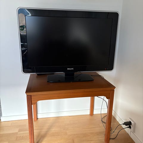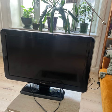 Svart TV från Grundig med fot som står stadigt på bänk. Enkel modell med knappar och anslutningar lättåtkomliga på framsidan/nertill.