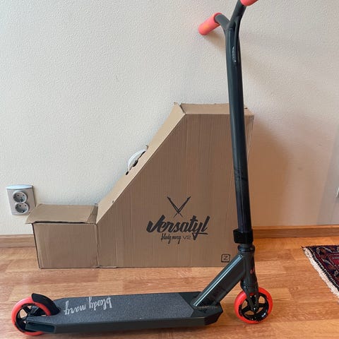 Svart stuntkickbike från med röda hjul och handtag. Stadig modell med bred fotplatta och Y-styre i metall.