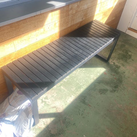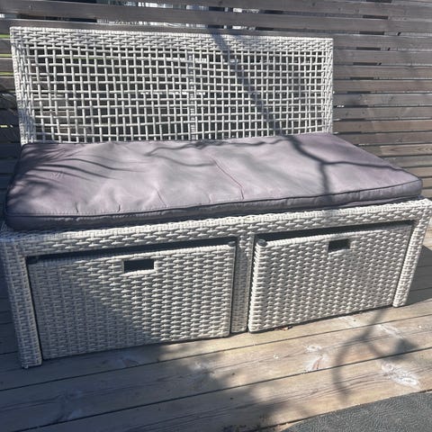 De behöver tvättas med högtryckstvätt. Då ser de betydligt bättre ut. Den vita bänken har två trasiga plankor. I övrigt är de i bra skick.