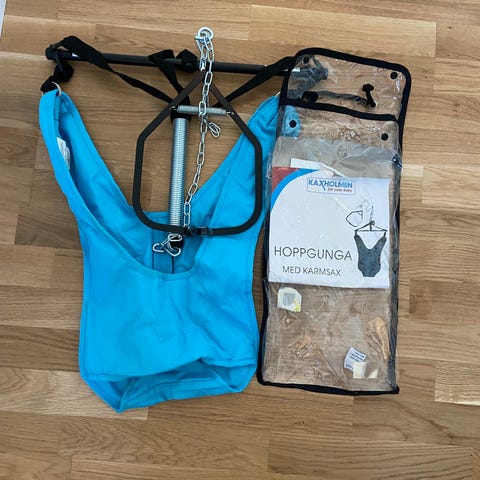 Säljer vår hoppgunga från Kaxholmen, använt av ett barn. Sätts enkelt upp i dörrkarmen och justeras till passande höjd.