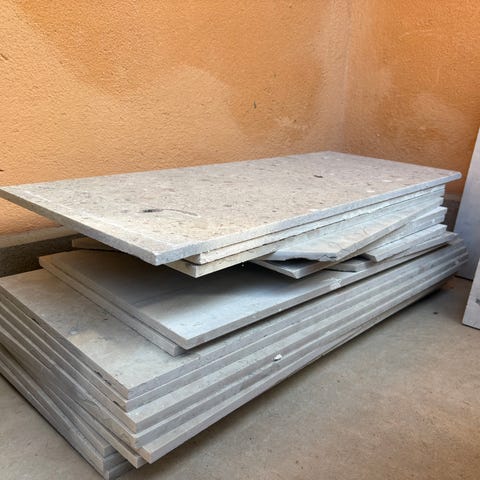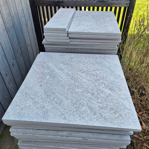 Säljer rejäla plattor i granitkeramik av hög kvalitet. De är 2 cm tjocka, vilket gör dem extremt tåliga och helt frostbeständiga.