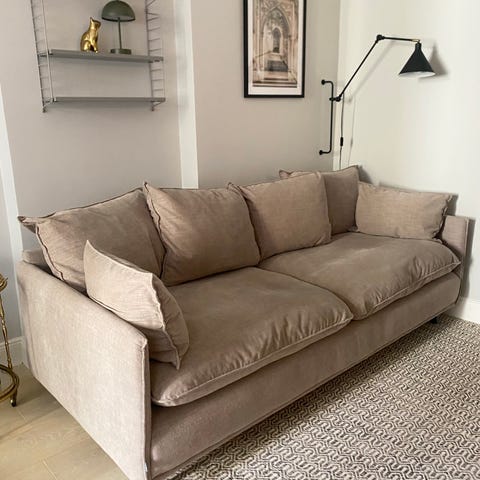 Stilren och modern soffa från Em home i gott skick. Soffan har ett armstöd och ett mycket skönt tyg och stoppning.
