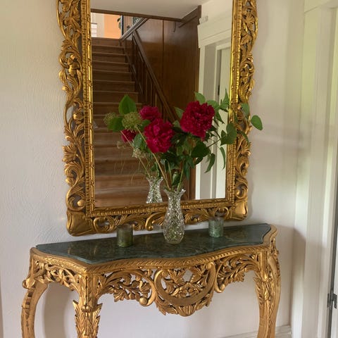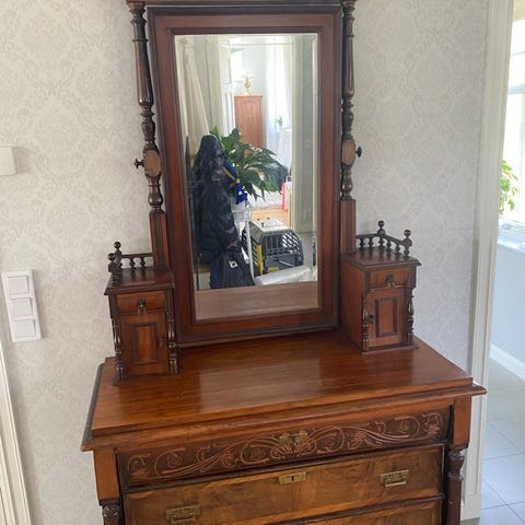 Gammal spegelbyrå/sminkborf i mahogny oval spegel och snidade detaljer. Har flera lådor och skåp med små beslag som ger bra förvaring. Djup 60
