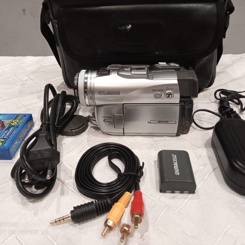 Kompakt digital videokamera med utfällbar LCD-skärm och tillbehör som nätadapter, har utgång som A/V-kablar och FireWire, tillbehör