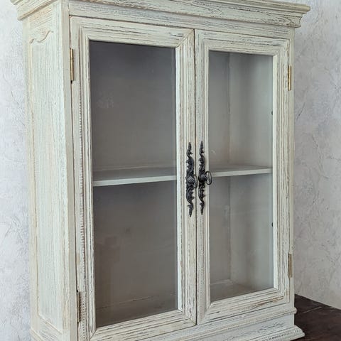HÄNGVITRINSKÅP, "Tullgarn", Nr. 54, Åmells möbler. Grått väggmonterat vitrinskåp med glasdörrar och spröjs. Flera vågiga hyllplan inuti och metallhandtag med lås på dörren.