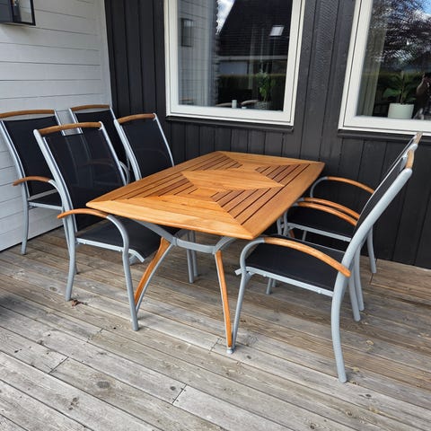 En del av färgen på matbordets ben har flagnat. Dessa partier har vi lackerat över i mattsvart. Stolarna och dynorna är i väldigt fint skick.