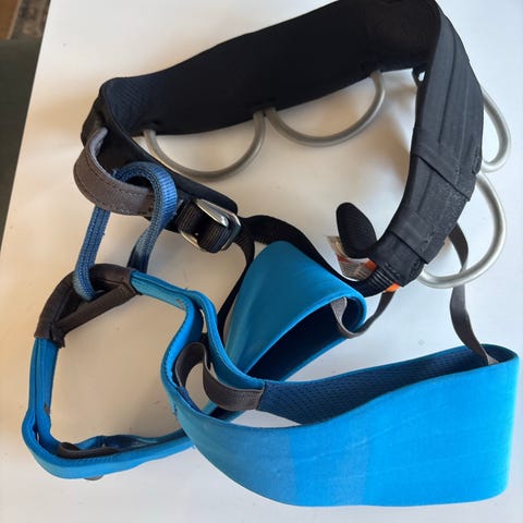 Klättersele från Edelrid i blå/turkos med gula detaljer. Har flera öglor för utrustning och kraftiga spännen runt midja och ben.