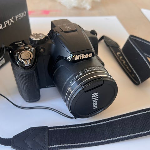 Nikon Coolpix P500 digitalkamera i svart med 36x zoom och vridbar skärm. Har flera reglage uppe på kameran och rem för att hänga den runt halsen. Väska, laddare och minneskort.