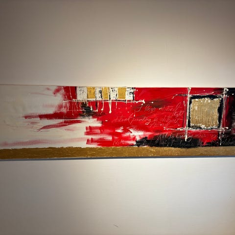 Stor abstrakt målning med flera färgblock, som fyller väggen bra och ger fin färg i rummet.