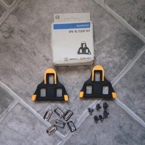 Shimano landsvägspedaler i svart med tillhörande klossar. Klassiska SPD-SL-typen med bred anläggningsyta och justerbar fjäder på baksidan.
