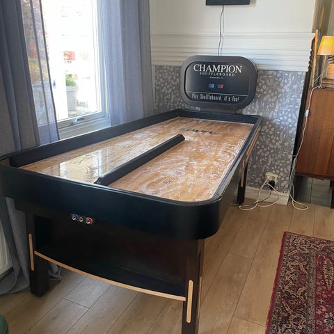 Spelbord med grön filtliknande skiva och träkant runt om. Benen är fällbara undertill så bordet är lätt att ställa undan när det inte används.