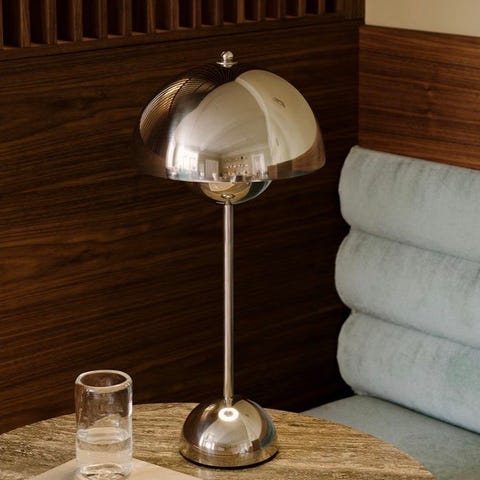 Portabel bordslampa från &Tradition designad av Verner Panton i matt ljusgrå färg. Laddas med USB-kabel och har kupad skärm.