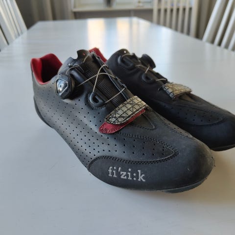 Scott racer cykelskor i stl 43, svarta med grå detaljer. Har tre remmar med spänne upptill och hård sula med fästen för klossar.