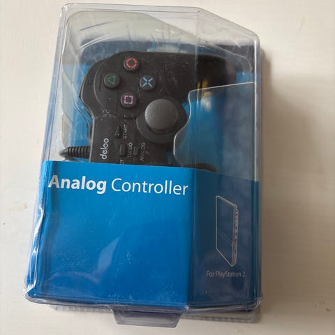 Svart Thrustmaster Dual Analog 4 handkontroll med kabel. Har två styrspakar, styrkors och numrerade knappar upptill och på framsidan.