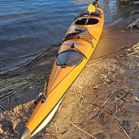 Grön kajak med sittbrunn och förvaringslucka fram och bak. Paddel följer med på bilderna och det finns elastiska snoddar på däcket för att spänna fast packning.