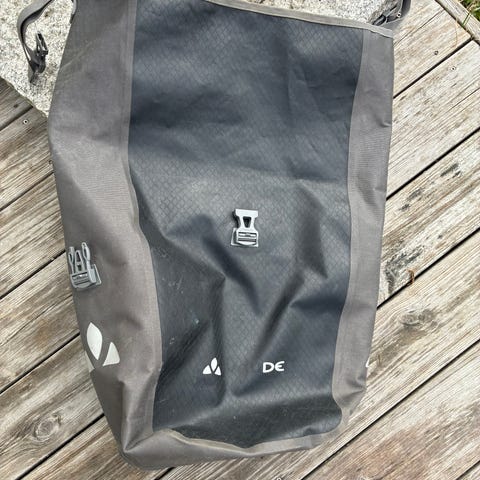 Cykelväska från Vaude i svart och grått med rullstängning upptill. Fästen på baksidan för pakethållare och en liten ytterficka med dragkedja fram.