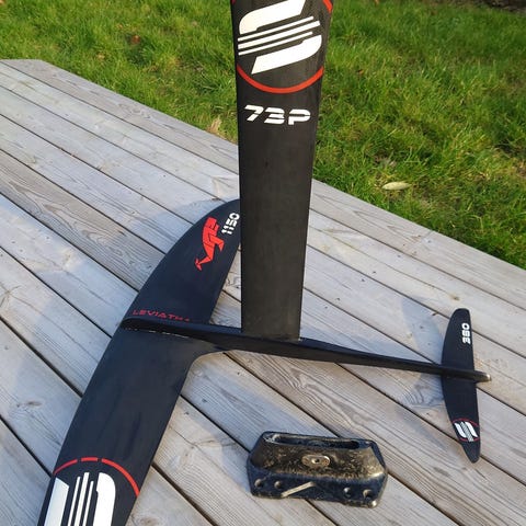 Aztron Falcon 6,6 foilbräda, F-One Swing wing v4 5,5m2 och Takuma Kijura foil. Foil har två set av vingar framvinge 1750 samt 1210, stab 218 samt 178. Två master 75cm och 80cm. 1750 är kanon att börja med och när man lärt sig lite kan man gå vidare med 1210 som funkar jättebra i vågor och har fint glid. Brädan är 115l och släpper helt ok lätt från vattnet när man ska upp på Foil. Sving vingen är mycket förlåtande och lätt (så man orkar hålla på länge!). Vingen är också grym i vågorna och flaggar fint. Brädan har en äldre ding som är lagad, läcker inte. Finns några ytliga dings också som jag lagt epoxi men dessa är bara i ytan. Vingen har en tejpad lagning som inte påverkar funktionen. Foil har en del repor men inget som påverkar funktionen. Jag körde på detta första året och har ni gått vidare till nästa nivå på utrustning.