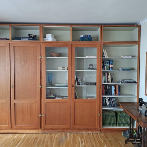 Skåpsrad bestående av fyra delar. Varje del har bredden 81 cm vilket ger en totallängd 324 cm för hela raden. Två av delarna är försedda med en glasdörr. Pris: 800 kronor per del eller 2800 kronor för alla fyra.