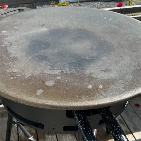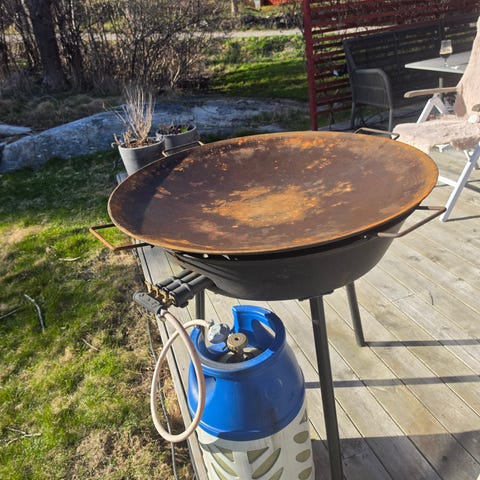 Muurikka stekhäll med gasbrännare på stativ, rund modell med handtag på sidorna. Med följer även en väska från Muurikka som syns på bilden, samt ett överdrag. Använd ett par säsonger, regulatorn bytt nyligen.