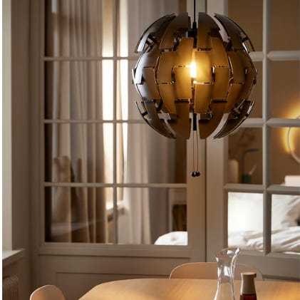 När du drar i snörena på taklampan IKEA PS 2014 får den lysande globen en form som påminner om ett rymdskepp där ljuset flödar ut.